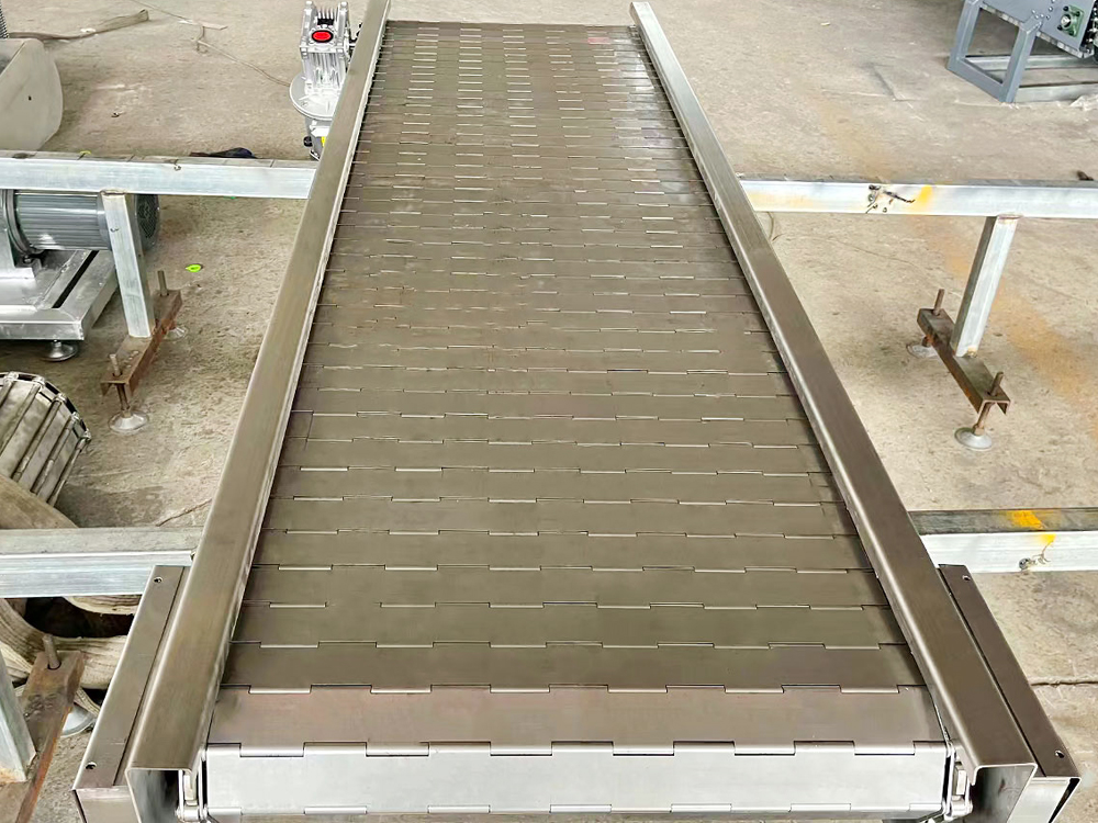 6、鏈板輸送機一般都可以直接用水沖洗或直接浸泡在水中,設備清潔方便,能滿足食品、飲料行業對衛生的要求;