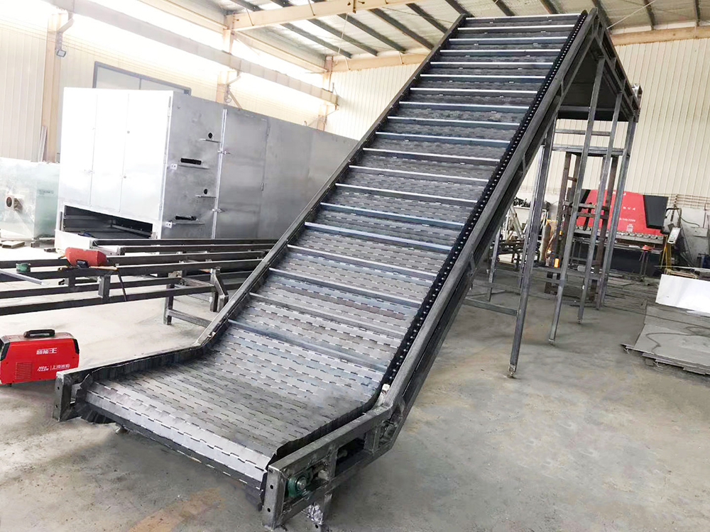 6、鏈板輸送機一般都可以直接用水沖洗或直接浸泡在水中,設備清潔方便,能滿足食品、飲料行業對衛生的要求;