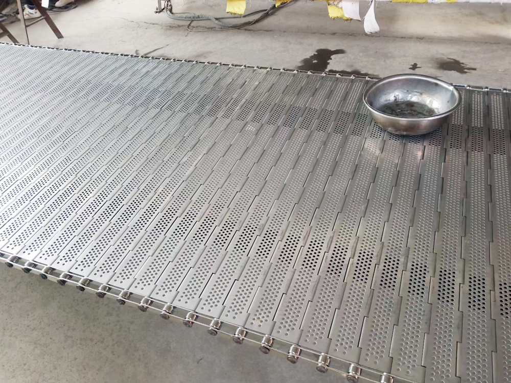 首先,在使用鏈板時,應避免與發熱源直接接觸,應該相聚至少一米以外,并且在露天使用時,應避免陽光直射等天氣因素。并且輸送速度應該小于2.5m/s。在使用過程中,鏈板的張力不宜過大,應在保證鏈板在與齒輪咬合和不彎曲的前提下盡量保持小張力。并且必須保證一臺機器中使用同等型號同等材質的鏈板。